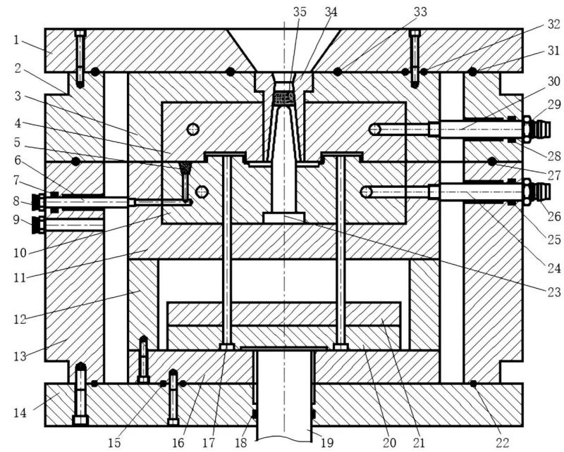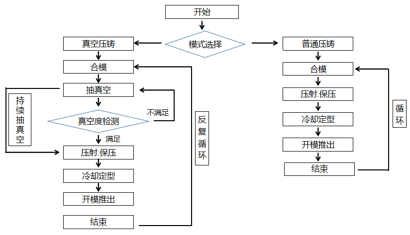 圖1 熱室高真空壓鑄工藝結構圖 模具抽真空口是與模外抽真空系統的連接通道,其作用是對模具型腔抽真空,同時避免壓鑄合金液被吸入抽真空系統中,對高真空壓鑄生產的穩定性起決定性作用。為了避免在模具中設計復雜的抽真空口開啟和閉合裝置,本工藝抽真空口的設計方案見圖1。在模具抽真空口前設置了具有通氣阻料功能的微孔塞5,其作用是抽真空時能讓模具型腔中的氣孔快速通入其中被抽離,壓鑄時能有效阻擋合金液進入其中,避免合金液進入抽真空系統,該部件由酚醛樹脂加熱至熔融狀態后與細砂均勻混合后壓制而成,具有耐高溫、抗變形、透氣性好的優異性能。 在生產實踐中,為了便于安裝,將微孔塞制成梯形圓臺狀。在動模鑲件10靠近產品型腔末端溢料槽位置的后面設計一個梯形圓孔,如果是大型的壓鑄件可在型腔多個位置設置多個梯形圓孔,將微孔塞放置其中,在圓孔的底部開設抽真連接通道,再通過型腔抽真空管6與動模密封箱套板13上連接抽真空系統的抽真空口8相連,同時在動模密封箱套板13上開設了專用于對密封箱內部抽真空接口9。抽真空時,模具型腔內的氣體通過抽真空接口8抽離,密封箱內的氣孔通過抽真空接口9抽離。為防止外圍氣體進入密封箱內,在型腔抽真空管6上設置矩形密封圈7,在用于控制模具溫度的接水管24、30上設置密封圈25、28。這種抽真空口設計的特點是通過對模具型腔及模具外圍同步抽真空,能有效地提升模具型腔的高真空度,同時進一步簡化模具結構設計與生產制造難度。 由于方案是在普通熱室壓鑄機上實施高真空壓鑄工藝,因此,在進行高真空壓鑄生產前,需將抽真空系統與壓鑄機控制系統進行系統集成。抽真空系統硬件結構主要由電氣控制系統、電機、真空泵、真空罐、真空閥、真空度表、過濾器、傳感器、真空管道等零件組成。控制部分由PLC控制變頻器對三相異步電機的啟停及轉速進行控制,從而控制真空泵實施抽真空工藝。 圖2為系統集成后的壓鑄工藝流程,分普通壓鑄模式和高真空壓鑄模式。在普通壓鑄模式下,按照壓鑄機現有壓鑄流程進行壓鑄;在高真空壓鑄模式下,在壓鑄機開合模機構的作用下,使密封箱及模具合模,當傳感器檢測到合模完成信號后,傳輸信息至PLC控制系統,當PLC控制器接收完信息后,啟動電機運轉并通過帶傳動機構帶動抽真空泵對模具密封箱及模具型腔抽真空。當真空度達到要求后,由PLC控制系統的數據通信功能與壓鑄機控制系統進行信息交互,從而啟動壓鑄機的壓射流程。合金液在壓射機構的作用下,經模具直澆道、橫澆道、內澆口后注入模具型腔內,保壓結束后通過真空閥停止抽真空,待壓鑄件冷卻后,通過在壓鑄機開合模機構的作用下,使模具密封箱及模具處于開模狀態。通過壓鑄機推桿經模具推出機構將壓鑄件推出模外,再通過壓鑄機使模具密封箱及模具進行合模,至此完成一個生產周期。