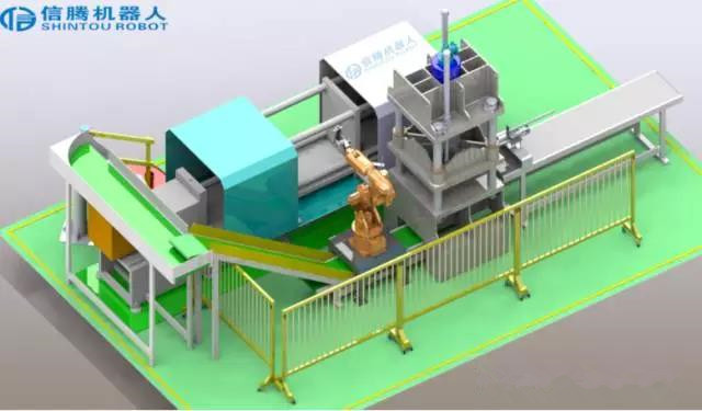 五、機器人取件噴霧一體、檢測、放入切邊機,待切好邊的產品由氣缸下料機械手取出放入輸送線。廢料渣包掉入廢料回爐線。特點:自動化程度高,生產效率高。如下圖