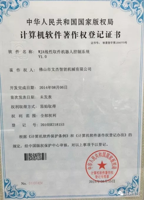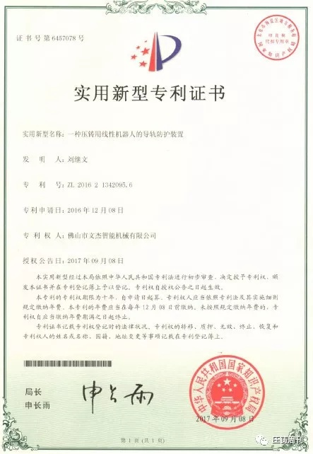 ![]() 發(fā)明專利 技術研發(fā)、技術創(chuàng)新是企業(yè)保持領先和立足于不敗的法寶。通過持續(xù)的技術研發(fā),企業(yè)可以不斷推出符合客戶需求、有競爭力的產(chǎn)品。佛山市文杰智能機械有限公司系壓鑄線性機器人領域的領軍企業(yè),公司是行業(yè)最早實現(xiàn)壓鑄線性機器人規(guī)模化生產(chǎn)的企業(yè),也是推動該領域技術進步的中堅力量。 佛山市文杰智能機械有限公司(“文杰智能”)董事長楊杰先生表示:“多年來,文杰智能持續(xù)不斷推出高效穩(wěn)定的線性機器人,從第一代到第四代,從輕型到重型的設備,從四軸到七軸機器人,從單一的取件或噴霧,到噴霧、取件、鑲件等多功能的機型,取得不俗的成績。這些都有賴于我們持續(xù)不斷的研發(fā)投入和技術創(chuàng)新。” 楊杰先生表示:“通過我們的帶動,目前壓鑄產(chǎn)業(yè)形成了獨有的線性機器人專業(yè)領域,吸引了一批自動化設備企業(yè)投身于線性機器人事業(yè)。作為行業(yè)的先行者,我們始終在行業(yè)肩負起引領者的角色,多年來投入大量的資金于基礎技術及前沿技術的研究,掌握了許多軟硬件的技術專利。” 據(jù)介紹,文杰智能“WJA線性取件機器人控制系統(tǒng)VI.0”、“WJA線性壓鑄機器人控制系統(tǒng)VI.0”、“WJA線性搬運機器人控制系統(tǒng)VI.0”軟件程序,獲得《計算機軟件著作權(quán)的登記證書》。同時,公司的“一種壓鑄用線性機器人的串聯(lián)升降臂”、“一種壓鑄用線性機器人的導軌防護裝置”獲得國家實用新型專利。