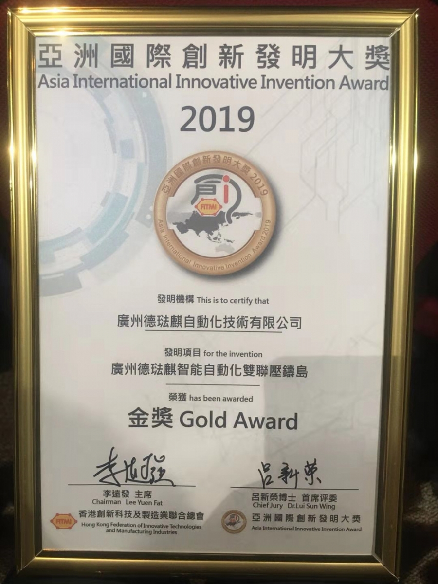 ![]() 蒲昌月先生與FITMI領導合影,右1為FITMI主席李遠發先生 11月25日晚,2019 FITMI香港創新科技成就大獎頒獎典禮,在香港亞洲國際博覽館隆重舉行。廣州德琺麒自動化技術有限公司開發的智能自動化雙聯壓鑄島,斬獲由香港創新技術及制造業聯合總會(FITMI)評選的“2019香港創新科技成就大獎:亞洲國際創新發明大獎之金獎”。廣州德法麒總經理蒲昌月先生代表公司出席典禮和領獎。 據悉,智能自動化雙聯壓鑄島此前已獲得兩個獎項。在今年3月舉行的“2019中國鑄博會”上,獲得由中國鑄造協會評定的“2019全國鑄造裝備創新獎”;在7月的“2019中國壓鑄展”上,榮獲由鑄造行業生產力促進中心、中國機械工程學會鑄造分會聯合評定的“2019壓鑄行業年度創新技術獎”。