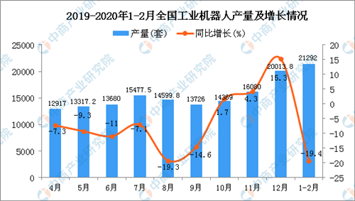 ![]() 據(jù)中商產(chǎn)業(yè)研究院數(shù)據(jù)庫(kù)顯示,2020年1-2月全國(guó)工業(yè)機(jī)器人產(chǎn)量波動(dòng)幅度不大,全國(guó)工業(yè)機(jī)器人產(chǎn)量為21292套,同比下降19.4%。