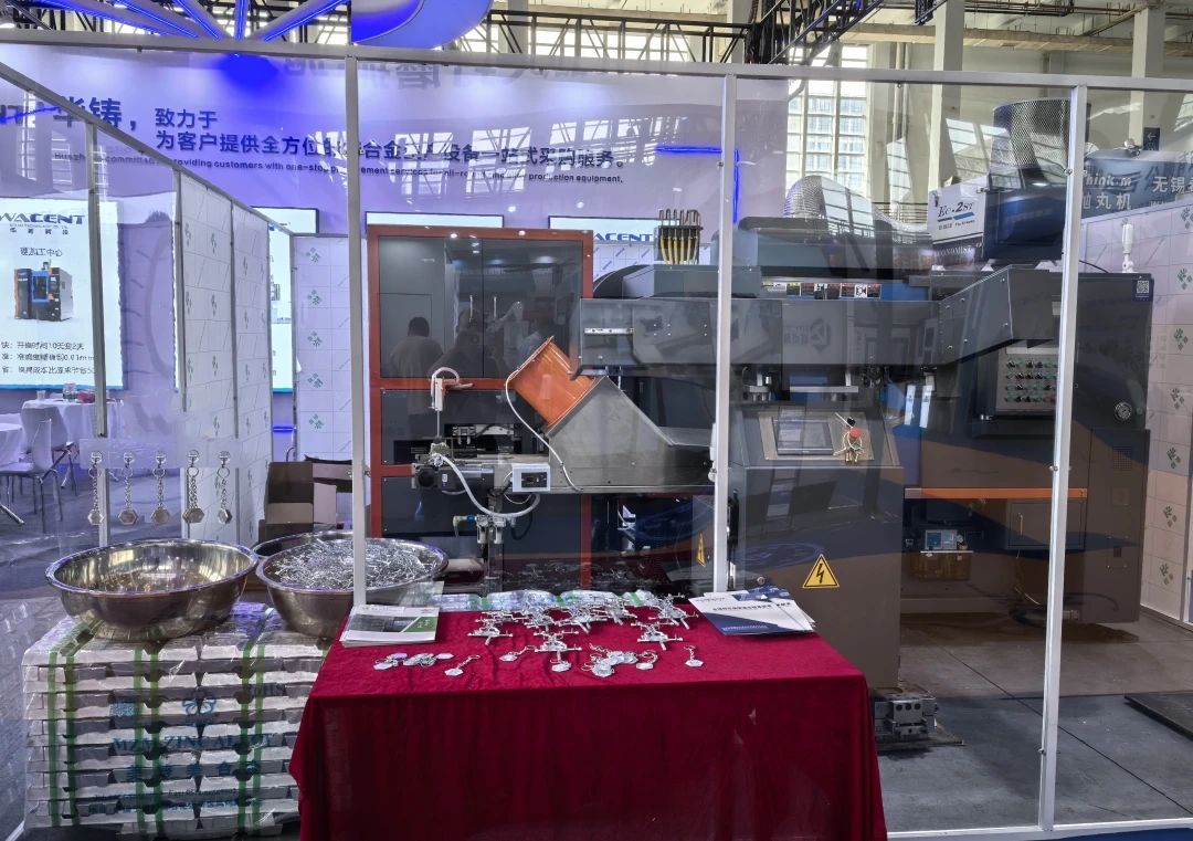 ![]() 2025年4月21-23日,“2025寧波國際鑄造及壓鑄展”在寧波國際會展中心成功舉辦。本屆展會吸引了來自全國各地的鑄造及壓鑄產業鏈上下游企業積極參展,集中展示了各企業的創新產品及技術成果。 華鑄科技:推介鋅壓鑄一站式設備采購及全套生產解決方案 在本屆展會上,廣東華鑄模具科技有限公司(簡稱“華鑄科技”)現場展示了一條38T無料咀熱室壓鑄自動化(閉環)產線,以及一臺型號為160T30的多用途標準熱室壓鑄機。 據了解,這條38T自動化熱室壓鑄生產線是專為黑燈工廠設計的。它以一臺38T無料咀熱室機為主機,配備了華鑄科技自主開發的高速取件機、水口自動分離系統、水口料回爐重熔系統以及輸送帶,形成了一條閉環的全自動化熱室壓鑄生產線。在展會現場,該生產線搭配華鑄科技的“1 + N”模具技術,用于生產鋅合金產品。