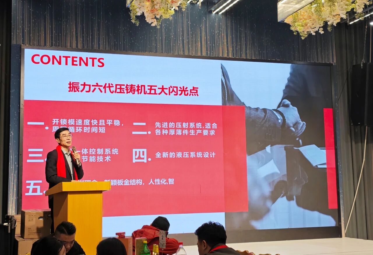 振力機械總工程師惠建學先生作報告 晚會的技術宣講環節干貨滿滿,為現場嘉賓帶來一場行業前沿分享。振力機械總工程師惠建學先生以《振力第六代系列壓鑄機》為題分享,該機型傳承公司二十五年制造經驗,契合行業新需求,融合先進機械設計、前沿控制技術及仿真液壓設計,是集實力與智能于一體的標桿產品。其核心優勢聚焦三大維度:優化機鉸結構并搭載 AI 算法,實現開鎖模快速平穩、循環周期短且重復精度高;升級壓射系統,優化關鍵部件并采用雙控制模式,普通機高性價比、高配機數字化操控,適配各類厚薄件生產;搭載四機一體控制系統與伺服節能技術,提升布局合理性與效率,降低噪音和油溫。 此外,該機型迭代液壓系統,提高壓力、優化管路,采用無焊接聯接技術及德國派克液控單向閥,保障運行穩定;融入歐洲設計理念,以新穎板金結構為基礎,在關鍵部位設置多重防護,實現人性化、智能化安全保障。這款匯集多項核心技術的壓鑄機,將為高精密、高要求鑄件生產提供優質解決方案,助力客戶創造更高價值與投資回報。