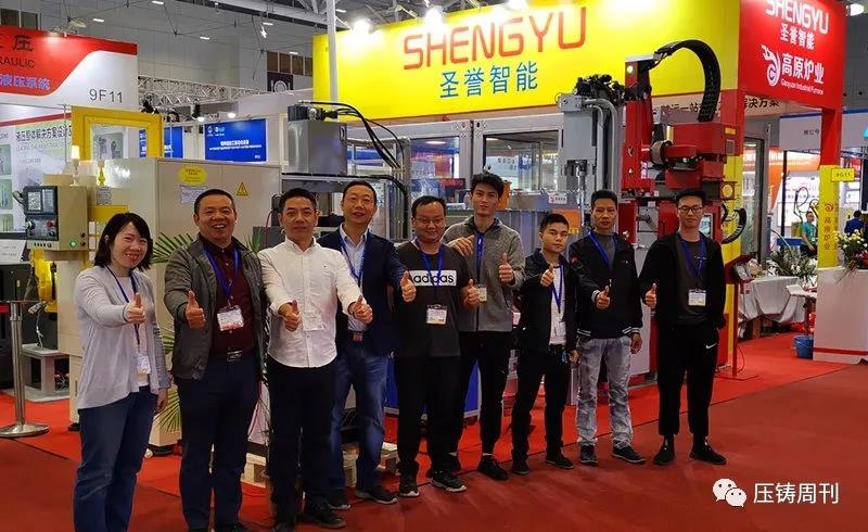 廣東圣譽參展團隊,左4為公司董事長劉繼文先生、左2總經(jīng)理羅圣科先生 QFZ系列壓鑄機系廣東圣譽聯(lián)合中山繼文五金塑料制品有限公司、佛山市蕎帆機電科技有限公司共同研制。劉繼文先生表示:“廣東圣譽運用其對壓鑄加工工藝了解透徹的專長,結(jié)合中山繼公司近30年的壓鑄生產(chǎn)創(chuàng)新理念、實踐經(jīng)驗,并配合佛山市蕎帆機電科技有限公司團隊對機械自動化探索和創(chuàng)新能力,三家公司在體驗中通過理解和邏輯思維、科學(xué)原理和規(guī)律,通力合作研制了簡潔、實用、多用途的創(chuàng)新型產(chǎn)品——立射式冷/熱室雙重功能壓鑄機。” 生產(chǎn)效率高,鑄件質(zhì)量好 該特種壓鑄機,壓射機構(gòu)采用立式射料設(shè)計,利用反向活塞原理,可最大限度實現(xiàn)射料過程無空氣卷入,允許模具在打開的情況下完成給湯動作,并在擠出殘留部分尚未完全凝固的情況下以頂起方式取出成品壓鑄件。這使得壓鑄件質(zhì)量大幅提升,生產(chǎn)周期大大縮短,經(jīng)濟效益明顯提高。
