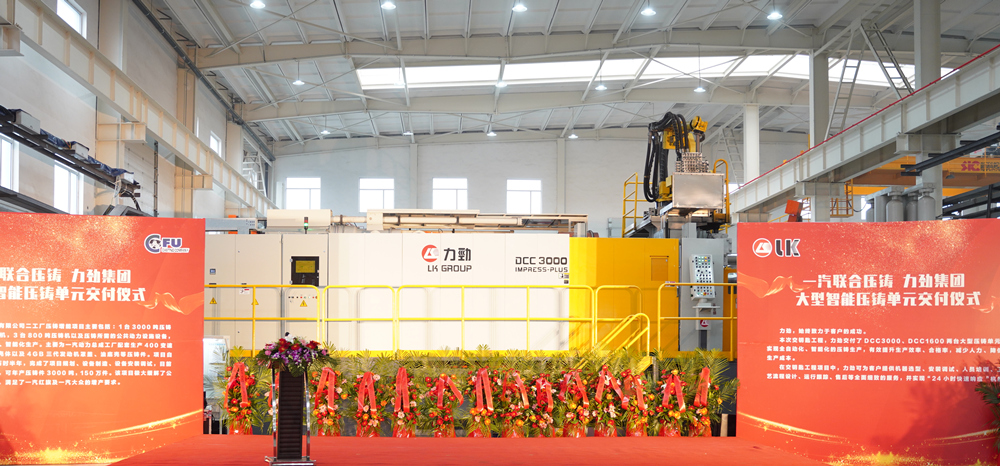 一汽聯合壓鑄總經理彭容林先生擔綱活動主持 力勁大型智能壓鑄單元交付 此次力勁大型智能壓鑄單元交付,為交鑰匙工程,力勁交付了DCC3000、DCC1600兩套大型壓鑄單元,實現全自動化、智能化的壓鑄生產,有效提升生產效率、合格率,減少人力、降低生產成本。