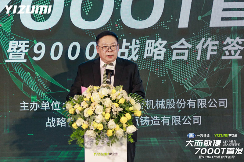 一汽鑄造有限公司黨委書記、董事長鄧為工致辭 鄧為工表示:“一直以來,一汽鑄造與全球優質客戶同步開發汽車類重要鑄件及大型結構件的輕量化。伊之密 9000T 壓鑄機的引進,將解決未來生產超大型汽車結構件的工藝瓶頸。此次合作,雙方將共同為新能源汽車發展注入新的動力,為新能源汽車輕量化提供一條低成本、高效率的道路。”