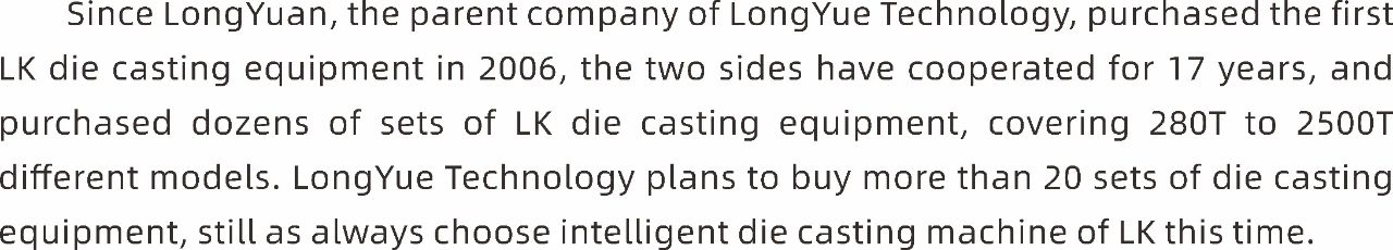 隆躍科技的母公司隆源股份自2006年采購第一臺力勁的壓鑄設備以來,雙方合作已達17年之久,累計采購力勁壓鑄設備數十臺套,涵蓋了280T到2500T不同機型。本次隆躍科技規劃的二十余臺壓鑄設備,仍然一如既往地選擇了力勁的智能壓鑄機。