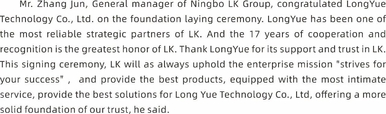 力勁集團寧波力勁總經理張均先生對隆躍科技奠基儀式表示祝賀。“作為力勁可靠的戰略合作伙伴,長達17年的合作認可,是力勁最大的榮幸,感謝隆躍科技對力勁的支持與信任。本次簽約,力勁將一如既往地秉承‘始終致力于客戶成功’的企業使命,為隆躍科技提供最好的產品、配備最貼心的服務、提供最優的解決方案,為這份信任添磚加瓦。”他表示。