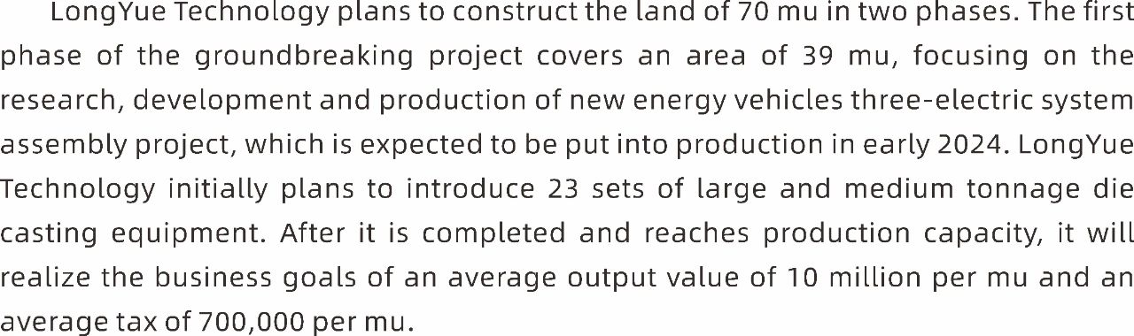 隆躍科技規劃用地70畝,分二期進行建設。本次開工奠基的一期項目占地39畝,聚焦研發與生產新能源汽車三電系統總成項目,預計2024年初投產。隆躍科技初步計劃引進大中型壓鑄設備23臺,建成達產后將實現畝均產值1000萬、畝均稅收70萬的經營目標。
