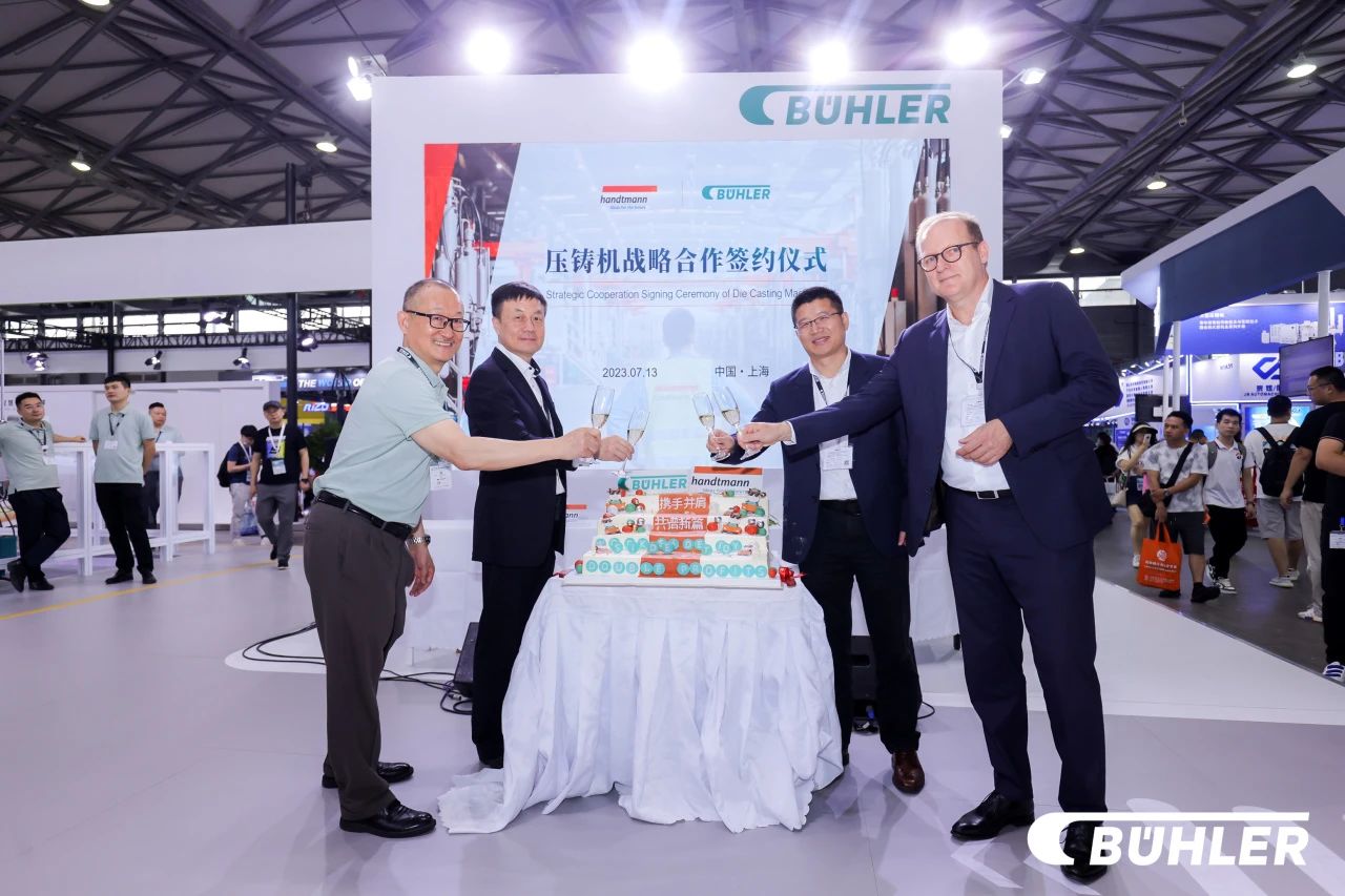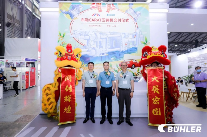 ![]() 2023年7月12-14日,第十七屆上海國際壓鑄暨有色鑄造展在上海隆重舉行。本屆展會以“邁向大壓鑄時代的協同發展與創新”為主題,展出面積36,900平方米,有來自463家公司的產品、技術和服務匯聚展會,上海國際壓鑄暨有色鑄造展是一個匯聚了壓鑄行業的頂尖企業和專業觀眾的重要平臺,吸引了有色、壓鑄產品及裝備相關應用的專業觀眾蒞臨參觀。 布勒作為上海壓鑄展多年的合作展商,本屆展會帶來了最新的超大型一體化解決方案,吸引了觀眾的廣泛關注。這些解決方案通過整合各種先進概念及裝備,為壓鑄行業帶來了更高效、更可靠的生產方式。另外,利用數字化的展示手段,例如布勒虛擬世界(Bühler Virtual World),觀眾們可以在展會現場體驗到布勒的技術創新和裝備性能的卓越表現。 強強聯合 共鑄未來 7月13日上午10點,伴隨著鏗鏘鼓聲,靈動的舞獅表演拉開了布勒與宏燦的交付儀式。隨著合作協議的交付,宣告了雙方進一步合作的開端,布勒作為交付商,將竭盡全力為宏燦壓鑄業務提供優質的裝備和技術支持,也希望以此交付為契機,能更好地為宏燦壓鑄業務的宏圖偉業添磚加瓦,保駕護航,互利共贏,共同發展。