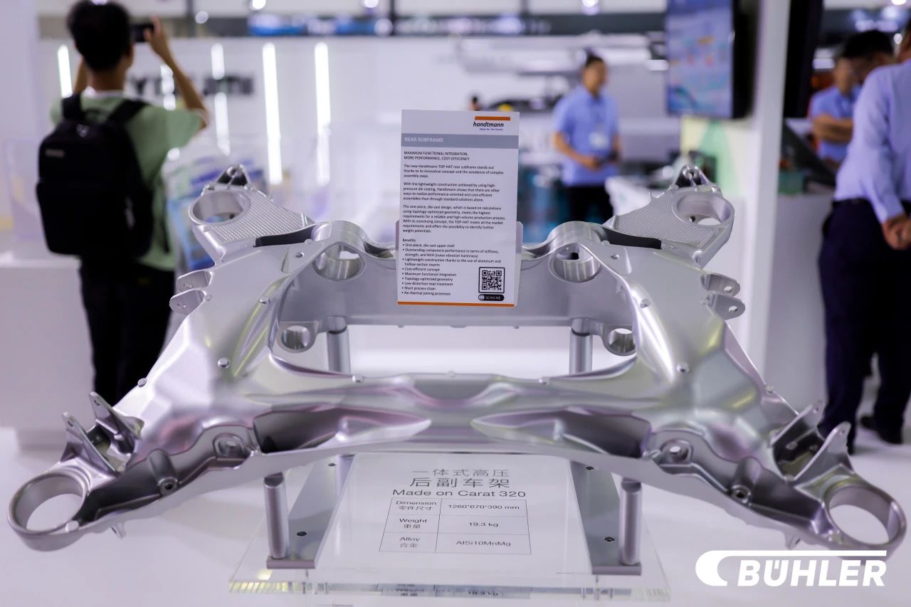 同時,我們也展出了漢特曼的一體式高壓副車架。 目前絕大多數副車架都是通過低壓鑄造所得,質量比較穩定,但工藝流程長,節拍慢等因素限制其生產效率。