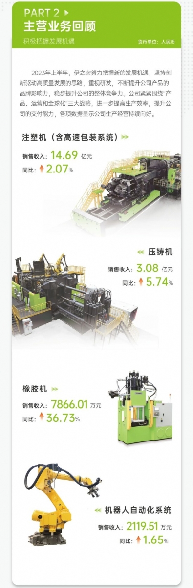 ![]() 8月30日,深交所上市企業(yè)--伊之密股份有限公司(簡(jiǎn)稱:伊之密)在2023年上半年業(yè)績(jī)報(bào)告中表示,今年上半年,全球經(jīng)濟(jì)形勢(shì)依然復(fù)雜多變,公司通過(guò)推出新產(chǎn)品、改變銷售策略、優(yōu)化供應(yīng)鏈管理等策略積極應(yīng)對(duì),努力提升公司業(yè)績(jī)。從公司所處行業(yè)來(lái)看,下游汽車行業(yè)繼續(xù)保持增長(zhǎng)態(tài)勢(shì),尤其在新能源汽車板塊,有較快速的增長(zhǎng),為公司帶來(lái)新的發(fā)展機(jī)遇。