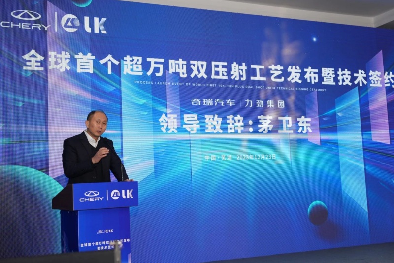 奇瑞新能源研發中心副總經理茅衛東致辭 在發布會上,深圳力勁科技董事長劉卓銘先生表示,雙壓射技術創新對于力勁乃至整個壓鑄行業而言都具有十分重要的意義。同時感謝奇瑞汽車對力勁的認可與信任,力勁將全力以赴投入資源,確保本次合作的超萬噸雙壓射壓鑄設備研發成功。