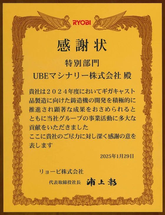 宮內社長接受浦上社長(左)的感謝信 回顧2023年9月14日,宇部機械曾發布新聞稿稱,其收到了利優比Ryobi采購6500T超大型壓鑄機的訂單。據介紹,宇部機械在2022年11月舉辦的“日本壓鑄會議暨展覽會”上宣布開始接受UB6500iV2壓鑄機的訂購。