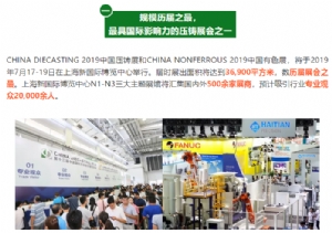CHINA DIECASTING 2019中國壓鑄展和CHINA NONFERROUS 2019中國有色展將于2019年7月17-19日在上海新國際博覽中心(SNIEC)N1-N3館舉行,展出面積36,900平方米,預(yù)計500余家中外知名壓鑄企業(yè)同臺展出,2...
