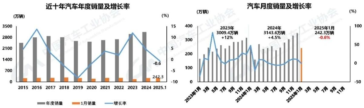 1月,汽車產銷分別完成245萬輛和242.3萬輛,環比分別下降27.2%和30.5%,產量同比增長1.7%,銷量同比下降0.6%。