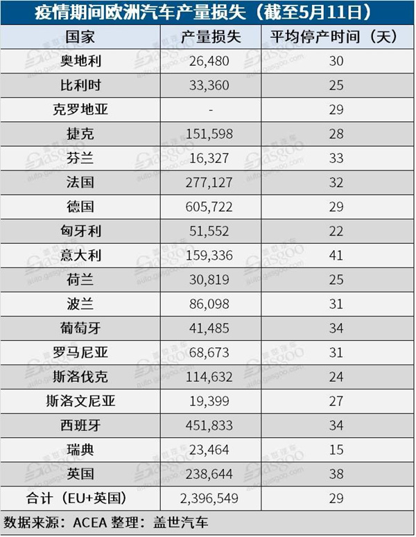 根據(jù)歐洲汽車工業(yè)協(xié)會(huì)(ACEA)整理的數(shù)據(jù),從3月中旬至5月11日,歐盟范圍內(nèi)因疫情關(guān)閉工廠造成的產(chǎn)量損失已達(dá)2396549輛。