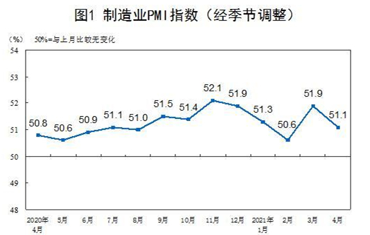 4月份,中國制造業采購經理指數(PMI)為51.1%,低于上月0.8個百分點,仍高于臨界點,制造業繼續保持擴張態勢。
