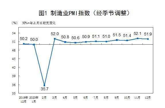 2020年12月份,中國制造業采購經理指數(PMI)為51.9%,雖比上月回落0.2個百分點,但連續10個月位于臨界點以上,表明制造業繼續穩步恢復。