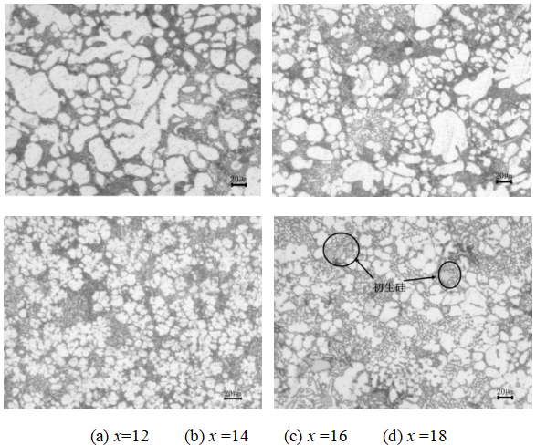 壓鑄鋁合金ZL102室溫組織中的物相包括初生α(Al)、鋁硅共晶組織、初晶硅以及少量的金屬間化合物。固溶處理后,壓鑄鋁合金ZL102中的硅相發(fā)生了熔斷和球化。