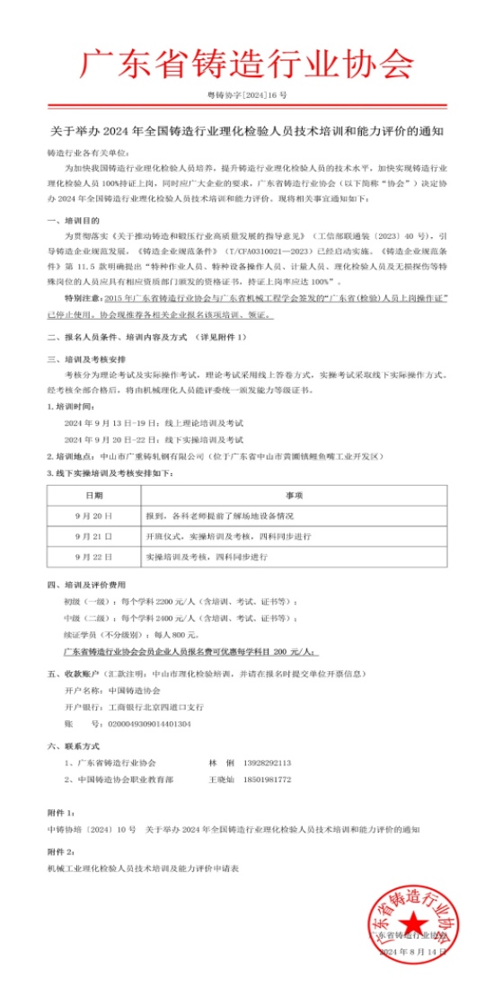 關(guān)于舉辦2024年全國(guó)鑄造行業(yè)理化檢驗(yàn)人員技術(shù)培訓(xùn)和能力評(píng)價(jià)的通知
