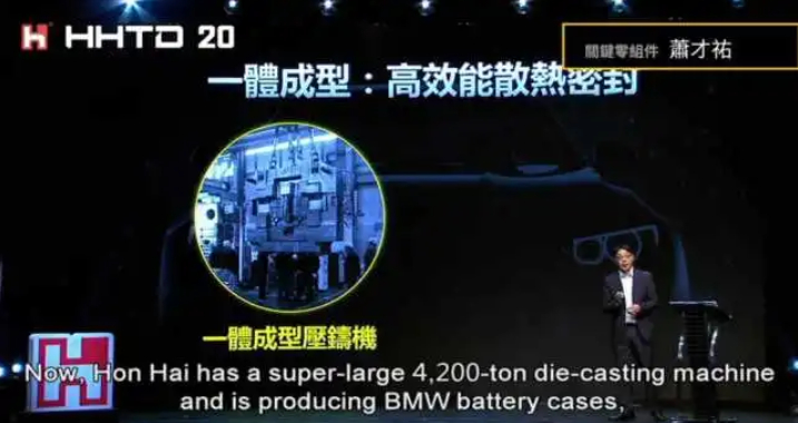 在鴻海科技日上,鴻海的首席產(chǎn)品官(CPO)Jerry Hsiao蕭才祐介紹,富士康成功地將7個前懸架車身板和27個后縱軌部件分別減少為單一鑄造件。