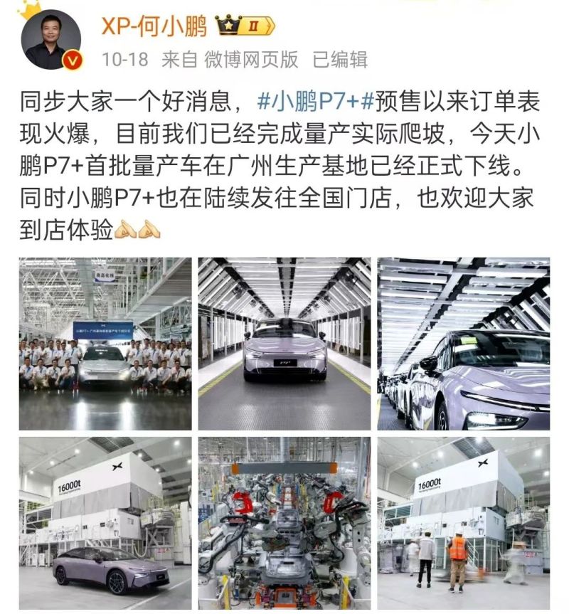 10月18日,小鵬汽車董事長何小鵬宣布,小鵬P7+汽車首批量產車在廣州生產基地順利下線。