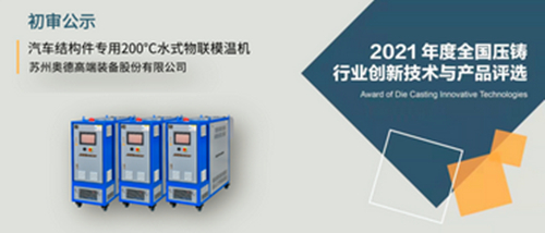 蘇州奧德研發的“汽車結構件專用200°C水式物聯模溫機”榮獲“2021年度壓鑄行業創新技術”稱號。