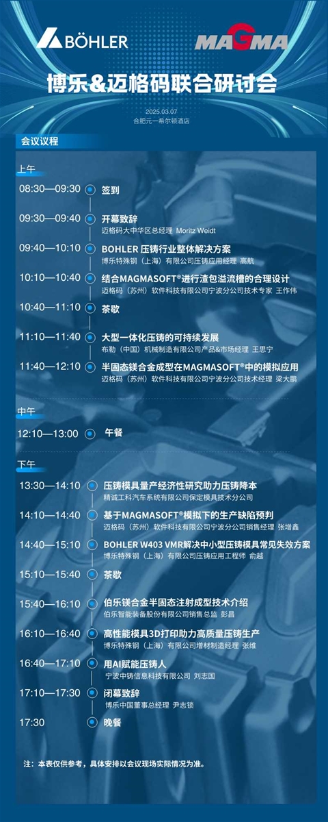 2025年10月31日,博樂特殊鋼、邁格碼聯合壓鑄研討會,將于廣東省廣州市南沙越秀喜來登酒店舉行。