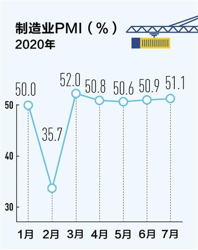 7月份,中國(guó)制造業(yè)采購(gòu)經(jīng)理指數(shù)(PMI)為51.1%,比上月上升0.2個(gè)百分點(diǎn),連續(xù)5個(gè)月位于臨界點(diǎn)以上。