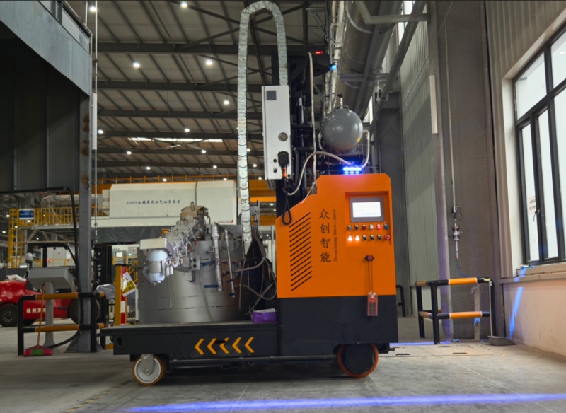 創(chuàng)新技術:一種基于AGV的在線配湯方法及其操作系統(tǒng) 申報企業(yè):寧波眾創(chuàng)智能科技有限公司 創(chuàng)新背景 ◆ 傳統(tǒng)的鋁水包轉運采用人工駕駛叉車進行轉運和卸料,一旦發(fā)生鋁水包泄漏或傾翻,會直接威脅到操作人員的生命安全。 ◆ 壓鑄機缺料及對應料號只能依靠人力判斷,多有發(fā)生加料不及時和加錯鋁料牌號現(xiàn)象。 ◆ 由于壓鑄車間24小時連續(xù)運行的特點,加之熱加工的特性,聲音嘈雜的環(huán)境中人員容易困乏,叉車運行過程中發(fā)生碰撞幾率較高。