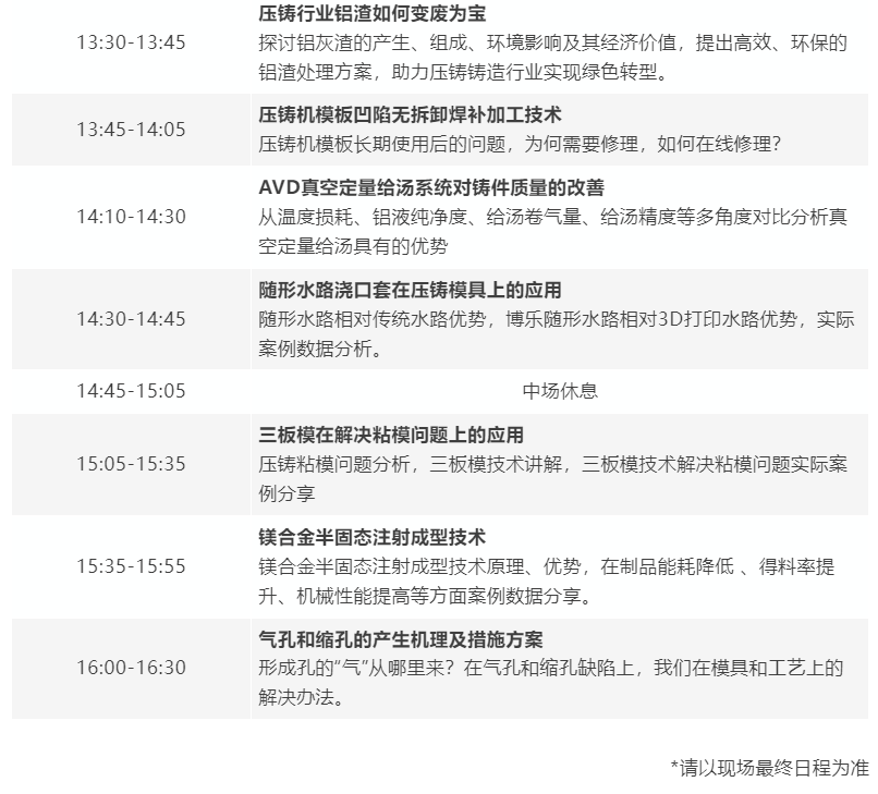 此次研討會的參會規模設定為 600 人,由國哥擔任活動主持。會議設置了 12 個演講主題,活動內容全面覆蓋多個領域,包括但不限于關于鎂合金半固態注射成型、壓鑄模具設計、模具使用壽命的考量、沖頭潤滑顆粒的合理選擇、氣孔與縮孔問題的研究、鋁渣資源化利用途徑探索、管理策略與成本降低方法探討、隨形水路澆口套的應用分析、AVD真空定量給湯技術的相關內容。