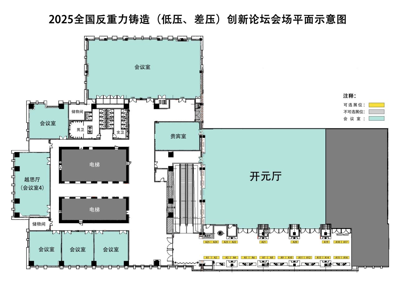 展位分布圖 ★展示費用:5000元/個 ★展示權益: 1. 提供展臺一個,1桌2椅,配套燈光,展臺由主辦方負責印刷搭建; 2. 免除參展單位一人會務費(原價1800元/人),包括五星級酒店自助餐、招待晚宴、資料費、場地、參觀等費用; 3. 微信發布的關于2025反重力鑄造論壇軟文時在文章底部掛參展單位公司logo; 4. 在論壇期間對展臺直播采訪,時間約為5min(自愿); 5. 在2025反重力鑄造論壇會刊中刊登參展單位公司/產品廣告; 6. 在壓鑄界微信公眾號推文中懸掛甲方banner廣告30天。 7. 提供發票,稅率為1%。 8. 與行業決策者面對面交流