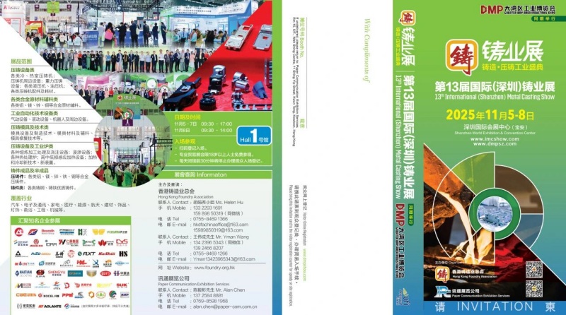 產業多元化發展,涵蓋汽車摩托車零部件、家居建筑燈飾五金等傳統領域,以及3C、醫療器材等高端場景,尤其是新能源汽車領域的爆發式增長,推動產業加速升級。區域內匯聚比亞迪、廣汽集團、小鵬汽車、華為等眾多終端企業,以及廣東鴻圖、文燦集團、宜安科技、精明集團、銘利達、東莞鴻圖、嘉瑞集團、力勁集團、伊之密等鑄造及壓鑄產業鏈上下游本土龍頭企業,為國際(深圳)鑄業展奠定雄厚產業基礎。 國際(深圳)鑄業展由香港鑄造業總會與訊通展覽公司聯合主辦,歷經多年精心打造,已成為華南地區最具影響力的鑄造及壓鑄行業展會。本屆展會將進一步凸顯“立足華南、輻射全國”定位,吸引近百家產業鏈上下游優質企業參展。展品范圍廣泛,覆蓋鑄造及壓鑄主機、自動化及周邊設備、環保設備、模具鋼、檢測設備等全品類,從鋁合金、鎂合金、鋅合金等原材料,到去毛刺、清洗等后處理設備,完整呈現產業生態布局。
