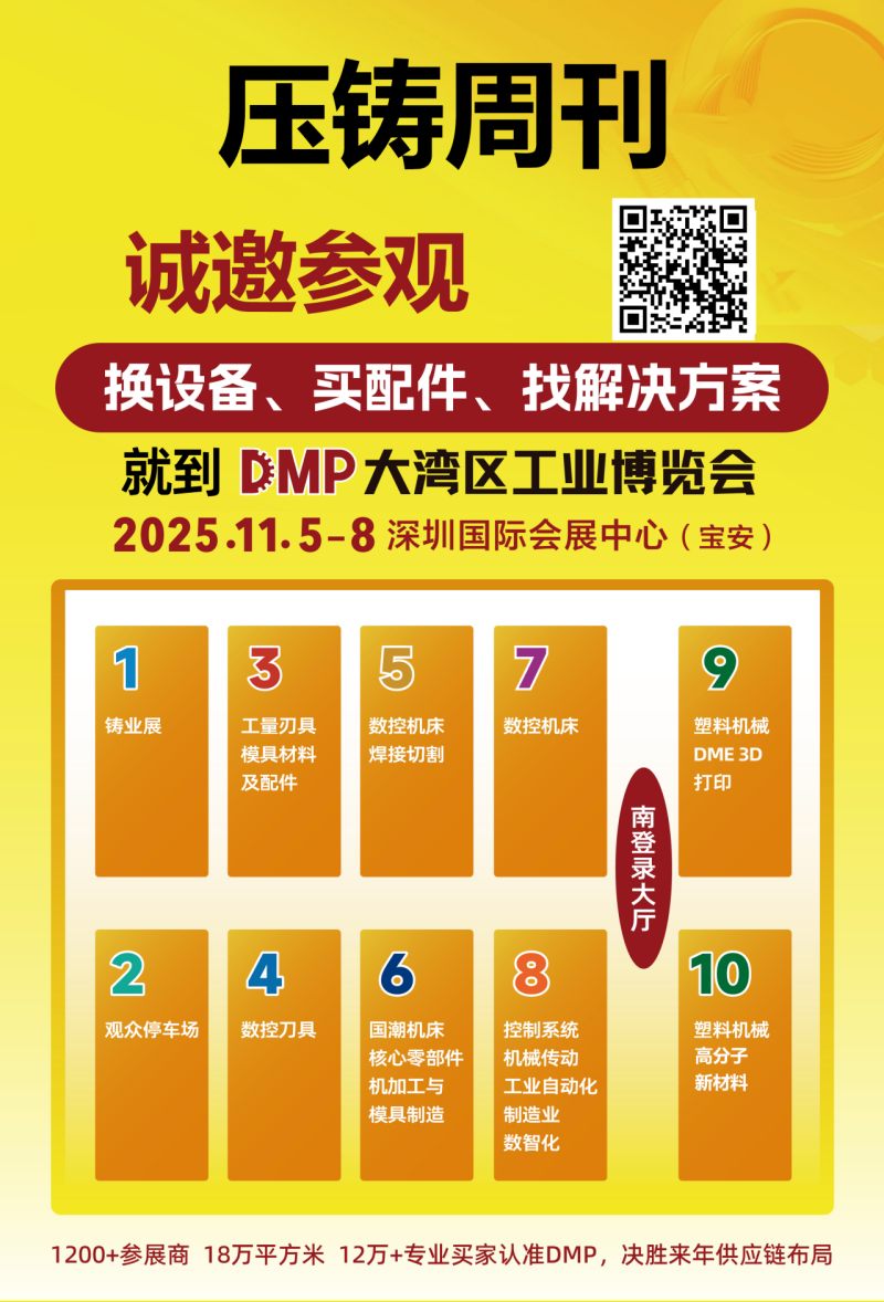 ![]() 《壓鑄周刊》展位圖 讀者見面會|企業訪談 2025 年 11 月 5-8 日,“第十三屆國際(深圳)鑄業展” 將在深圳國際會展中心(寶安)隆重開幕。展會期間,《壓鑄周刊》傳媒不僅精心打造專屬展臺,更特別策劃 “讀者見面會” 與 “企業訪談” 兩大主題活動,為行業人士搭建開放的交流平臺,誠邀您蒞臨參與!