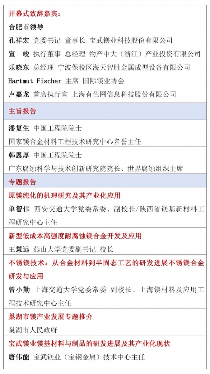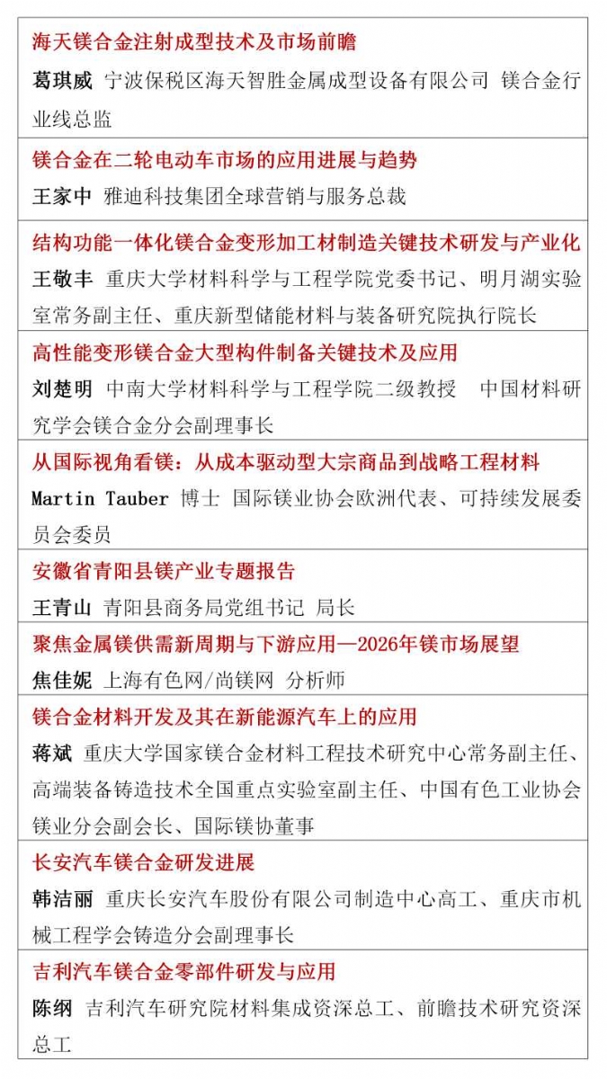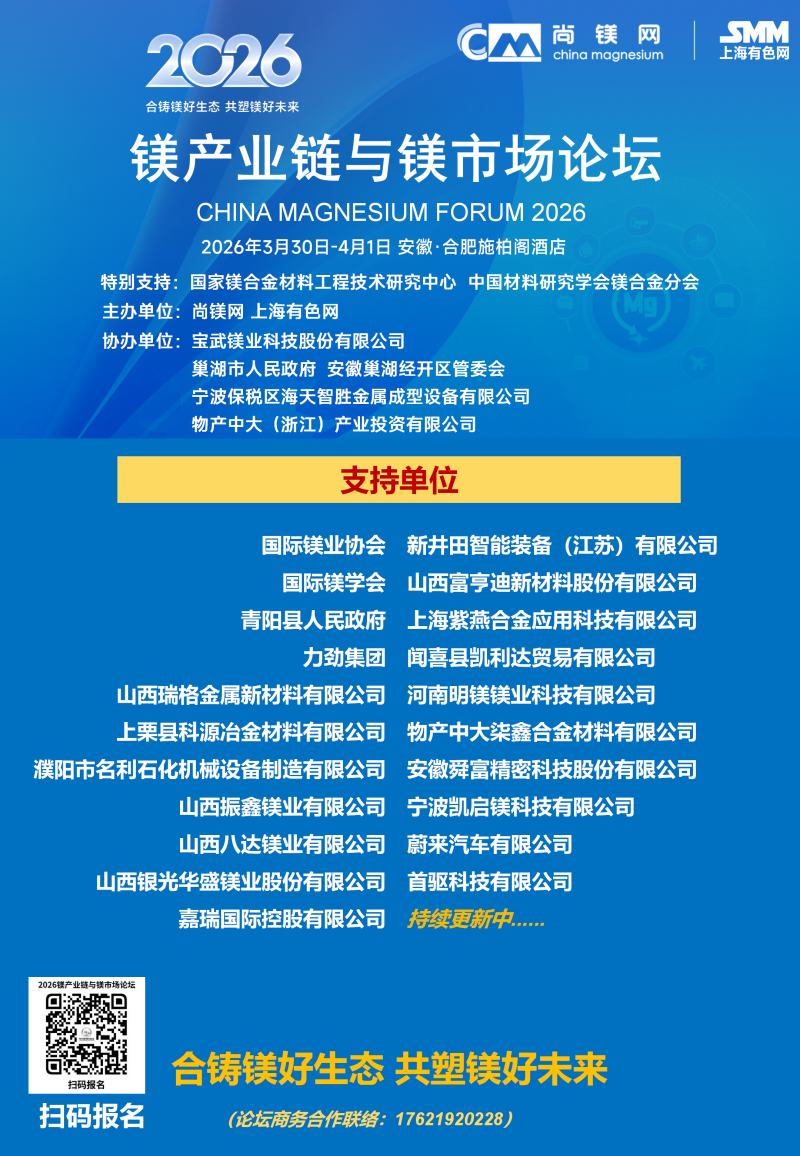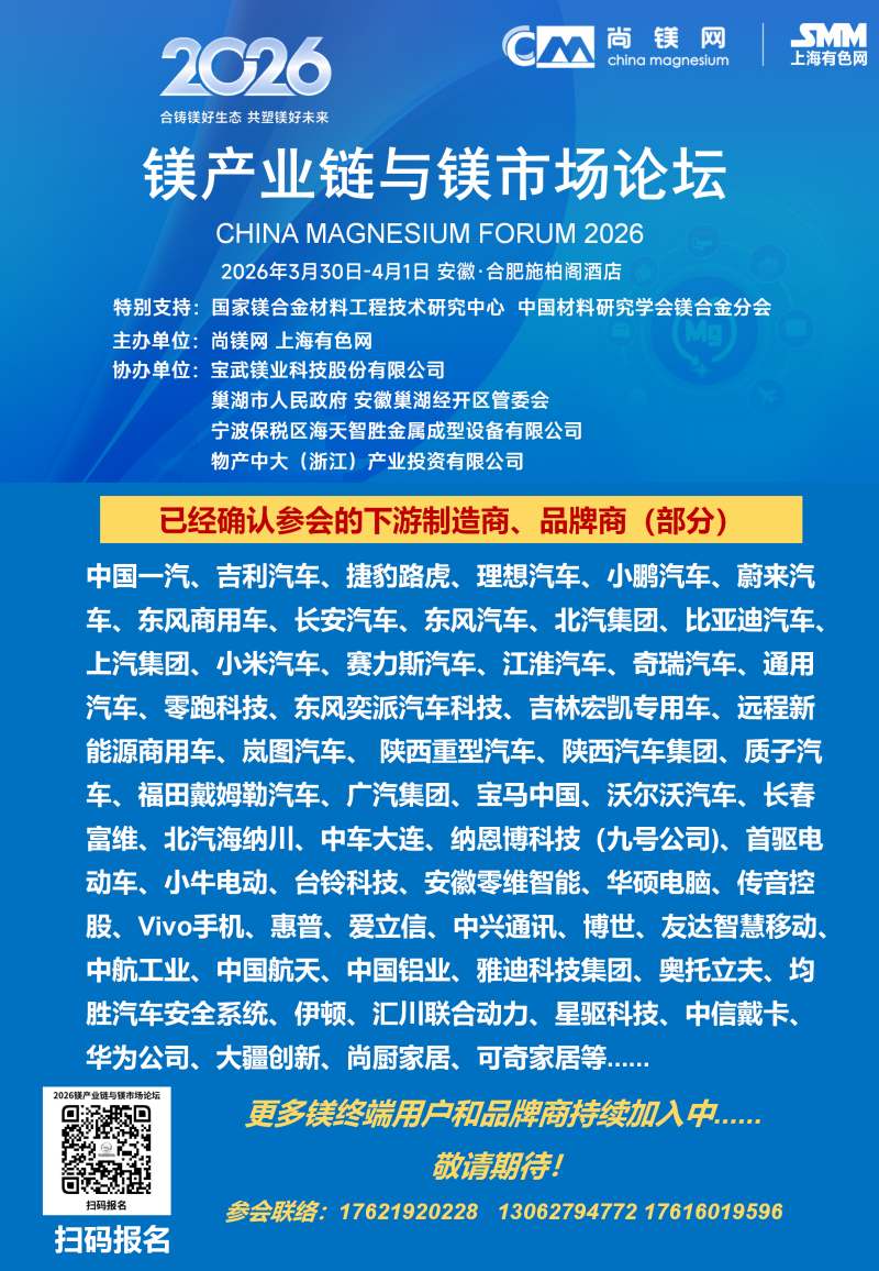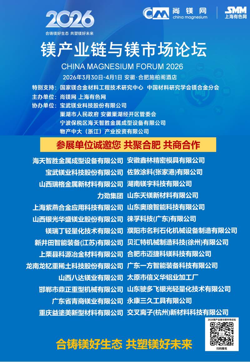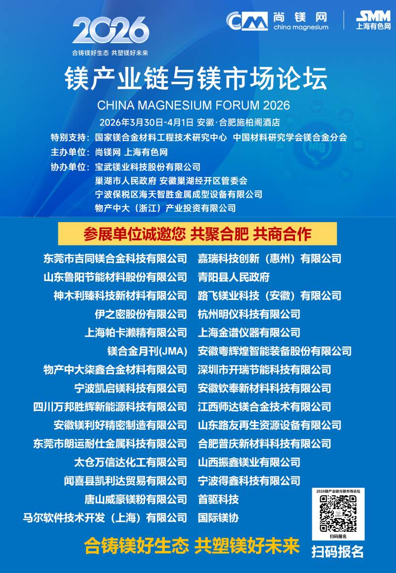 ![]() 2026年的鎂行業,正站在供需改善、需求爆發、政策加持的關鍵拐點,一場屬于鎂合金的春天正在到來。春光不等人,商機不重來。當下正是布局鎂產業鏈、鎖定訂單、拓展渠道、升級技術的黃金窗口期。值此時刻,"2026鎂產業鏈與鎂市場論壇"將于3月30日-4月1日在合肥市盛大啟幕。論壇由國家鎂合金材料工程技術研究中心、中國材料研究學會鎂合金分會特別支持,尚鎂網、上海有色網聯合主辦,寶武鎂業科技股份有限公司、巢湖市人民政府、安徽巢湖經開區管委會、寧波保稅區海天智勝金屬成型設備有限公司、物產中大(浙江)產業投資有限公司等單位協辦,得到了鎂產業鏈眾多骨干企業的支持和參與。這將是本論壇連續第四年舉行。 本次論壇的主題是:合鑄鎂好生態,共塑鎂好未來。論壇的目的是及時交流鎂行業與市場信息,研討鎂制造和應用的前沿科技,為鎂產業鏈企業商業合作、投資合作提供機會,同時,鎂產業鏈各方將借此機會集中展現創新成果,在關鍵時刻在關鍵議題上為鎂行業發聲,營造鎂產業良好發展的氛圍,共商共議構建新型鎂產業生態鏈,助推鎂材料的規?;瘧?。 本屆論壇亮點紛呈:匯聚強大的論壇合作單位,凝聚行業最硬核力量,30家產業鏈企業及機構鼎力合作搭建鎂交流平臺。特邀32位有影響力和權威性的專家、企業高管發表致辭和演講,高密度分享鎂研發前沿科技、產業化成果及經驗。廣泛邀請全產業鏈相關方深度參與,搭建高效交流平臺,目前已有國內領先的鎂及鎂合金企業、零部件制造企業、30余家整車企業、頭部兩輪電動車企業、知名3C領域制造商和品牌商、鎂產業相關裝備、表面處理企業、研發機構、投融資機構確認與會。今年首設鎂合金材料和汽車鎂合金平行論壇,更深入交流當前鎂市場熱點。將有55家鎂產業鏈骨干企業集中展示,展現他們的鎂合金技術、產品與相關服務。主辦方希望借此盛會,助大家見到更大的舞臺,望見更高的山峰,直面問題、打開格局、拓寬視野、攜手共進。 不負春光,實干興邦;聚力鎂業,共贏未來。讓我們以春為序,乘勢而上,把鎂生意做得更穩、更實、更火,共同開創中國鎂產業高質量發展新篇章! 您的參與也將是論壇成功舉辦的重要方面,期待與您在春暖花開之際,共赴一場“皖鎂之約”! 鎂業盛典 產業風標 2026鎂產業鏈與鎂市場論壇 2026年3月30日—4月1日 安徽·合肥施柏閣酒店
