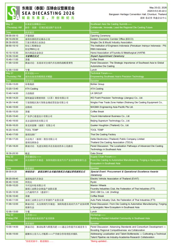 ![]() 4場(chǎng)圓桌×20+演講,60+展位熱銷,免費(fèi)預(yù)登記享好禮 東南亞唯一專注壓鑄產(chǎn)業(yè)的國(guó)際會(huì)議與展覽——第三屆東南亞(泰國(guó))壓鑄會(huì)議暨展覽會(huì)(SEA DIECASTING 2026),將于2026年5月20–22日在泰國(guó)春武里邦盛會(huì)議中心隆重舉辦。 依托前兩屆成功積淀,本屆大會(huì)全面升級(jí)、落位泰國(guó)東部經(jīng)濟(jì)走廊(EEC)核心區(qū)域,匯聚全球資源,共筑東南亞壓鑄產(chǎn)業(yè)新高地。目前60+展位已熱銷,觀眾免費(fèi)預(yù)登記正式啟動(dòng),誠(chéng)邀全球業(yè)界共襄盛舉,預(yù)計(jì)將吸引逾1500+專業(yè)觀眾參與。
