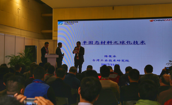 楊歡演講“尖端金屬鑄造數(shù)學(xué)模型” 臺灣工業(yè)技術(shù)研究院陳俊沐博士以“半固態(tài)材料之球化技術(shù)”為題做演講。陳俊沐先生介紹,半固態(tài)成型可減少亂流氣孔,與凝固收縮孔缺陷,且具有細(xì)致化鑄造組織,其機械性能可接近鍛造件。傳統(tǒng)鑄造材料進行半固態(tài)成型,其樹枝狀晶組織會造成壓鑄過程的固液分離,進而造成成份偏析,球化材料則較少偏析。