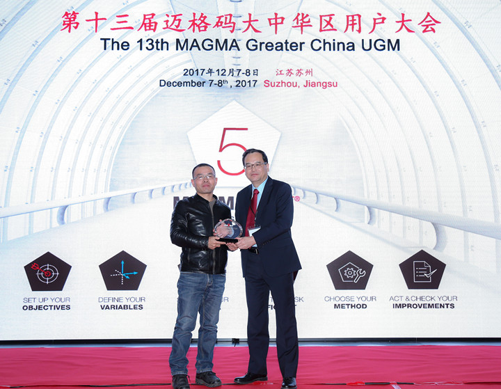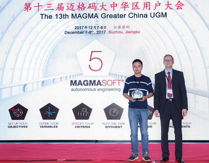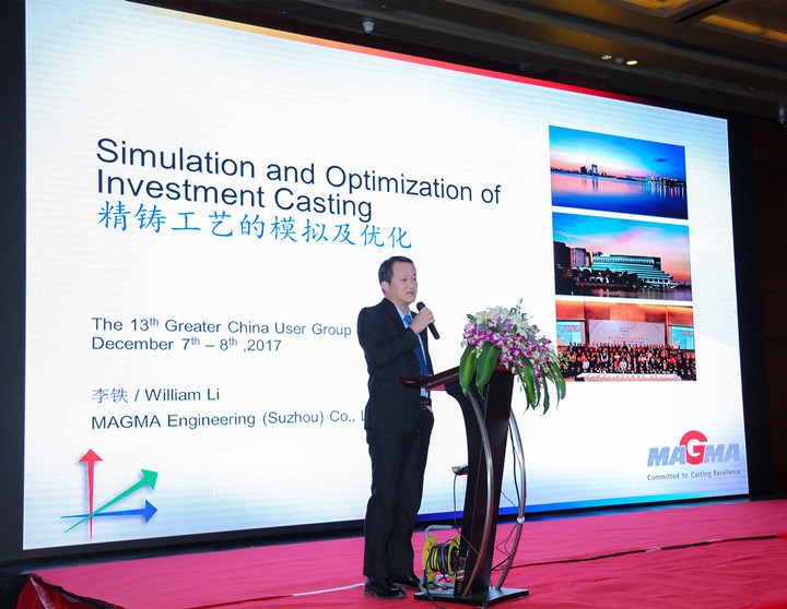 ![]() 全體人員合影 第十三屆邁格碼MAGMA大中華用戶大會(huì)在蘇州隆重舉行 初冬蘇州,寒風(fēng)徐來。2017年12月7-8日,第十三屆邁格碼大中華區(qū)用戶大會(huì)在蘇州中茵假日皇冠酒店隆重舉行。來自邁格碼亞洲總部(新加坡)總經(jīng)理趙望前博士、邁格碼(蘇州)軟件科技有限公司(下稱“邁格碼中國”)總經(jīng)理馬修先生及全體員工、全國各地的MAGMASOFT用戶單位代表,以及專業(yè)媒體記者等近160人相聚一堂,共同分享和探討MAGMASOFT鑄造模擬分析軟件功能、應(yīng)用和優(yōu)化。 本屆大會(huì)的焦點(diǎn)是圍繞著“使用MAGMASOFT5 5.3版以及全新的5.4版的功能,開發(fā)穩(wěn)健的工藝和優(yōu)化解決方案”而展開。首日的會(huì)議,邁格碼中國的資深技術(shù)工程師,介紹MAGMASOFT采用6步法,即“設(shè)立目標(biāo)-定義變量-明確標(biāo)準(zhǔn)-提高效率-選定方案-實(shí)施決策”,去幫助鑄造生產(chǎn)開發(fā)高效的工藝,以及得出完美的解決方案;而邁格碼的多家用戶單位也踴躍發(fā)言,帶來在鑄造行業(yè)各細(xì)分領(lǐng)域的應(yīng)用成果分享。