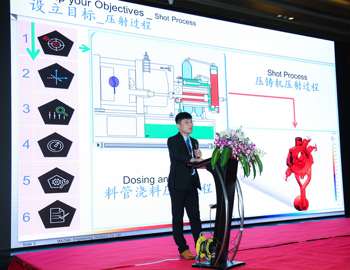 趙望前博士 緊接著正式進(jìn)入用戶大會(huì)的主要議題,介紹和分享MAGMASOFT的應(yīng)用成果及新功能。邁格碼中國的高杰先生分享了“MAGMASOFT 6步法(MAGMA APPROACH)在黑色金屬領(lǐng)域的應(yīng)用”報(bào)告;邁格碼中國的孫娜女士分別以“使用MAGMASOFT 6步法(MAGMA APPROACH)優(yōu)化低壓鑄造工藝”、“應(yīng)用MAGMASOFT 5.4的噴涂功能精確控制模具溫度”先后做兩次報(bào)告;邁格碼中國的劉琪明先生介紹了“MAGMASOFT 5.4版本如何確定最精確的高壓低速壓射速度”;邁格碼中國的王文權(quán)先生分享了“MAGMASOFT 5.4精確的冷卻控制及頂出變形”報(bào)告;邁格碼中國的嚴(yán)丹寧女士,介紹了“應(yīng)用MAGMASOFT 5.4全面快速分析砂芯發(fā)氣及熱平衡”。