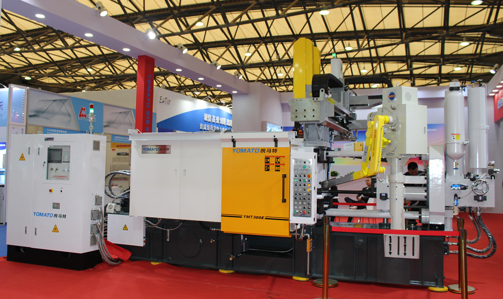 VM-800加工中心 在現(xiàn)場,一套D系列合模力400T壓鑄機,與MV-850、VM-800立式加工中心組合,配置取件、噴霧等機器人,組成一條從鋁壓鑄件毛坯壓鑄成型,到后續(xù)精密加工的智能自動化生產(chǎn)線,演繹壓鑄“工業(yè)4.0”。 江蘇悅馬特:優(yōu)良壓射性能的YMT300EC冷室壓鑄機 江蘇悅馬特機械制造有限公司,系近年來壓鑄機制造領(lǐng)域的后起之秀。憑借著“精做壓鑄機,服務(wù)壓鑄業(yè)”的經(jīng)營宗旨,產(chǎn)品受到市場歡迎和用戶認可,取得良好的業(yè)績,企業(yè)保持快速成長。在本屆鑄博會上,悅馬特攜一款在壓射機構(gòu)經(jīng)改良設(shè)計的YMT300EC冷室壓鑄機出展,踐行其為用戶提供穩(wěn)定、高效壓鑄裝備的承諾。