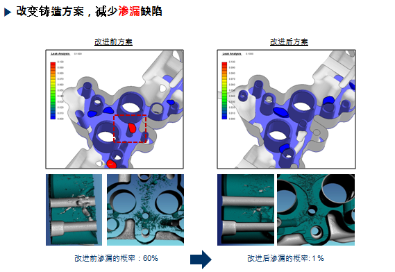 滲漏功能預測試壓泄露 滲漏缺陷作為鑄造生產中常見缺陷之一,廣受鑄造從業者的重視。所謂滲漏缺陷是指鑄件在壓力試驗(水壓或氣壓)中出現泄露現象。AnyCastingV6.6版本的滲漏模塊可通過綜合考慮鑄件粘膜位置、機加位置以及縮松體積等參數,精確預測鑄件試壓過程中可能存在的滲漏缺陷。