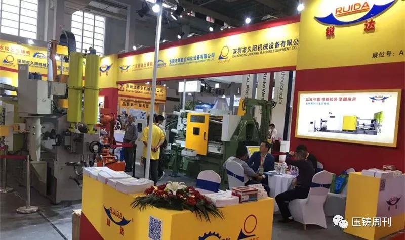 東莞銳風、東莞輝勝、深圳久陽機聯合展臺 銳達公司現場展示了一套冷室壓鑄單元和一套熱室壓鑄單元。其中,冷室壓鑄單元以銳達冷室壓鑄機RDC300為主機,該機型采用專利壓射系統,射料迅猛平穩,建壓時間快,成品率高;油冷式伺服系統,能耗低,相比標配的高低壓雙聯泵系統,節能40%-60%;單杠頂針系統,加強型機鉸,剛性提高40%-50%。 熱室壓鑄單元,由熱室壓鑄機 RDH160F為主機,鎖模柱架加強設計;采用內置式冷卻器,;鎖模速度進一步提升;扣咀形成加長;高品質球墨鑄鐵模板,整機更加強壯有力、穩定可靠,持久耐用。