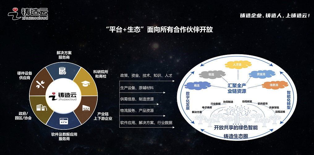 此外,在此次發布會上,為了更好地推動鑄造行業綠色智能和高質量發展,鑄造云還啟動了“鑄造智變·云啟未來”——鑄造云生態合作伙伴招募計劃,邀請軟件及數據應用服務商、解決方案服務商、硬件設備供應商、鑄造上下游企業、高校和科研院所、政府/園區/協會等共建“商流、物流、人才流、資金流、信息流” 五流合一的綠色智能鑄造生態圈,力爭將鑄造云打造成一個千億級的交易平臺、萬家鑄造企業活躍的行業社群、千家合作伙伴受益的生態圈層、百家高校和科研院所匯聚的研發平臺。