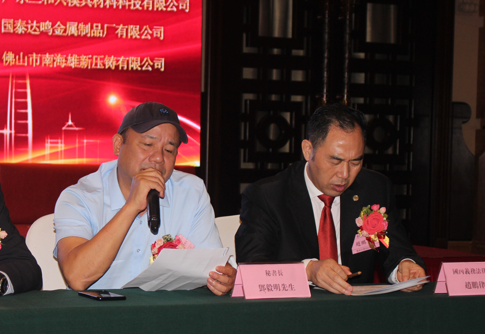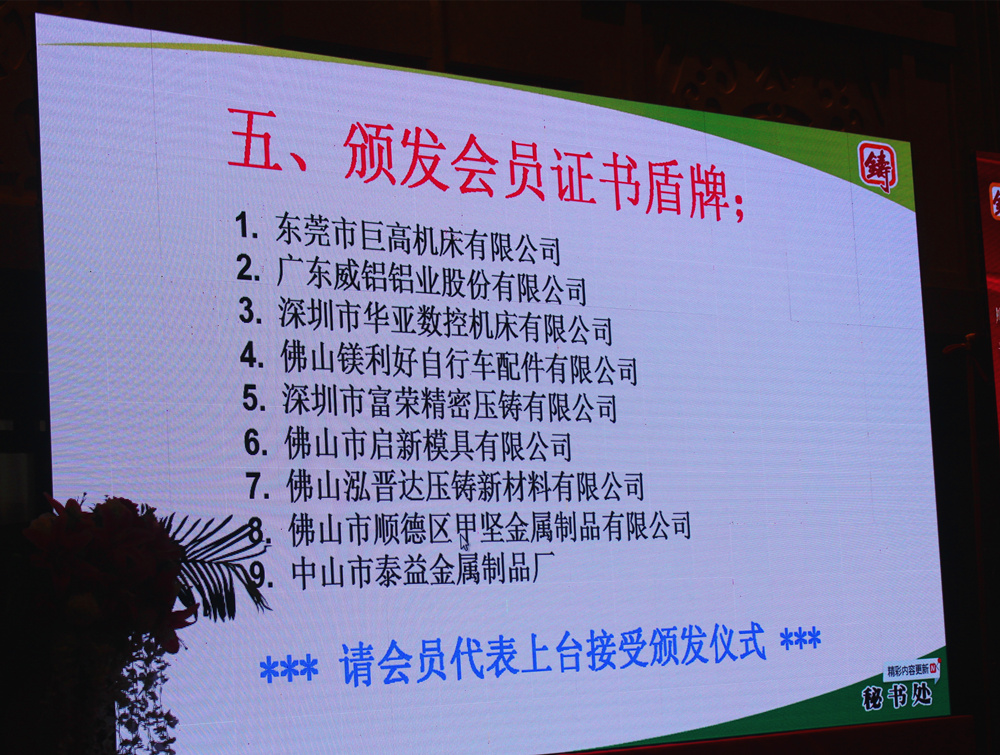為會員企業(yè)頒發(fā)會員盾牌 會上,蔡子芳會長為東莞市巨高機(jī)床有限公司、廣東威鋁鋁業(yè)股份有限公司、深圳市華亞數(shù)控機(jī)床有限公司、佛山鎂利好自行車配件有限公司、深圳市富榮精密壓鑄有限公司、佛山市啟新模具有限公司、佛山市泓晉達(dá)壓鑄新材料有限公司、佛山市順德區(qū)甲堅(jiān)金屬制品有限公司、中山市泰益金屬制品廠等9家會員企業(yè)代表一一頒發(fā)會員盾牌,并合影留念。