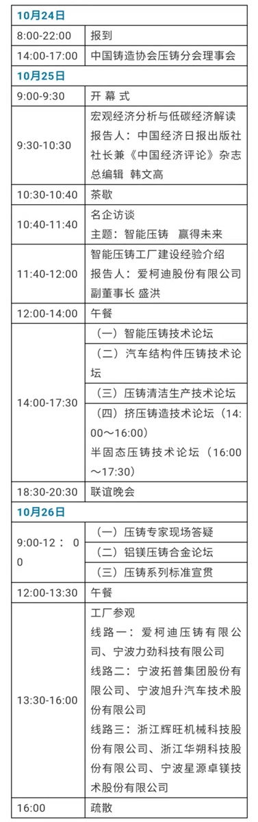 上一屆中國國際壓鑄高層論壇暨壓鑄CEO峰會現(xiàn)場 2021年對于中國壓鑄產(chǎn)業(yè)是充滿挑戰(zhàn)和機遇的一年。近年來,壓鑄產(chǎn)業(yè)發(fā)生著深刻的變化。新能源汽車的普及,壓鑄機超大型化、一體化壓鑄成型趨勢,都影響著壓鑄產(chǎn)業(yè)的發(fā)展方向。壓鑄工藝作為近凈成形技術(shù),進步日新月異。同時,技術(shù)自主可控正成為國家新的戰(zhàn)略決策,并將持續(xù)產(chǎn)生深遠(yuǎn)影響。 值此壓鑄產(chǎn)業(yè)轉(zhuǎn)型升級的關(guān)鍵時期,中國鑄造協(xié)會攜手15個省、市鑄造協(xié)會/學(xué)會和行業(yè)媒體,將于2021年10月24~26日,在中國壓鑄產(chǎn)業(yè)示范基地——寧波北侖的影秀城麗筠酒店舉辦“2021中國國際壓鑄高層論壇暨第三屆壓鑄CEO峰會”。 據(jù)了解,本屆峰會以“智能壓鑄,贏得未來”為主題,內(nèi)容將包括“宏觀經(jīng)濟分析”、“政策/標(biāo)準(zhǔn)權(quán)威解讀”、“前沿技術(shù)分享”、“著名專家答疑”、“壓鑄名企參觀”等板塊,旨在以政策、市場和技術(shù)的饕餮盛宴,廣聚海內(nèi)外壓鑄業(yè)同仁,群策群力助力中國壓鑄產(chǎn)業(yè)科學(xué)發(fā)展。 “中國國際壓鑄高層論壇暨壓鑄CEO峰會”由中國鑄造協(xié)會主辦。首屆峰會于2016年、第二屆峰會于2018年,分別在浙江嘉興、浙江寧波北侖成功舉辦。本屆大會的初步議程如下所示:
