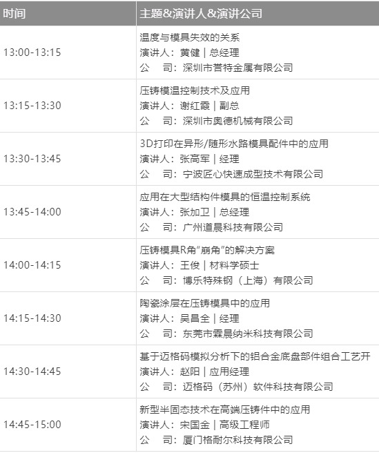 壓鑄模具應用技術研討會 12月10日下午13:00-15:00 本研討會主題涉及模擬分析、3D打印、模具材料等。其最新的研究應用均在此研討會范圍,如變形翹曲應力分析、異型水路打印、高導熱模具材料、模流分析等。