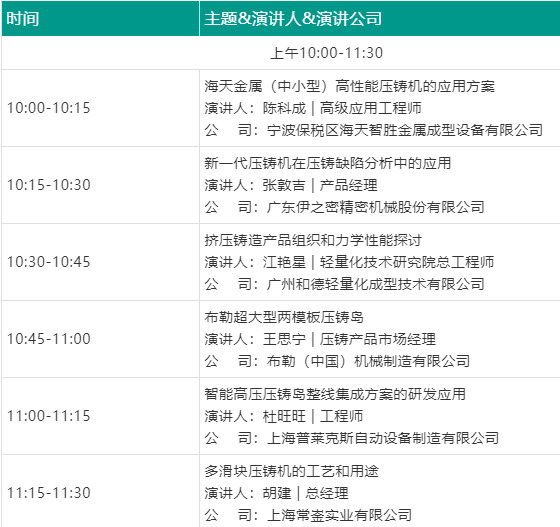 先進壓鑄設備技術研討會 12月11日上午10:00-11:30 下午13:00-14:45 本研討會主題涉及壓鑄機、定量熔爐、自動化、環保等。其最新的研究應用均在此研討會范圍,如超大型壓鑄機、高性能壓鑄機、多滑塊壓鑄機、伺服電機、超高真空技術、環保等。
