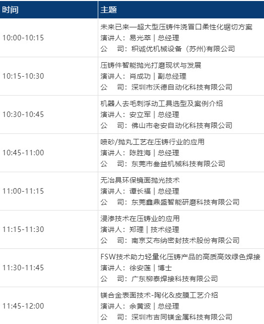 壓鑄件后處理技術研討會研討會 12月12日上午:10:00-12:00 本研討會主題涉及澆道渣包去除、打磨去毛刺、焊接等。其最新的研究應用均在此研討會范圍,如高速鋸去澆道、高效自動化去毛刺機、攪拌摩擦焊等。