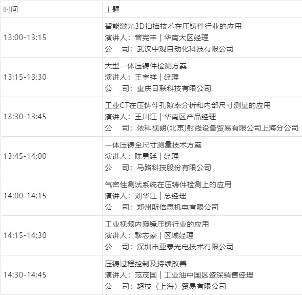 壓鑄生產檢測技術研討會 12月12日下午:13:00-14:45 本研討會主題涉及尺寸、內部孔洞、模溫等檢測。其最新的研究應用均在此研討會范圍,如激光掃描檢測、工業CT檢測、紅外線測溫檢測等。